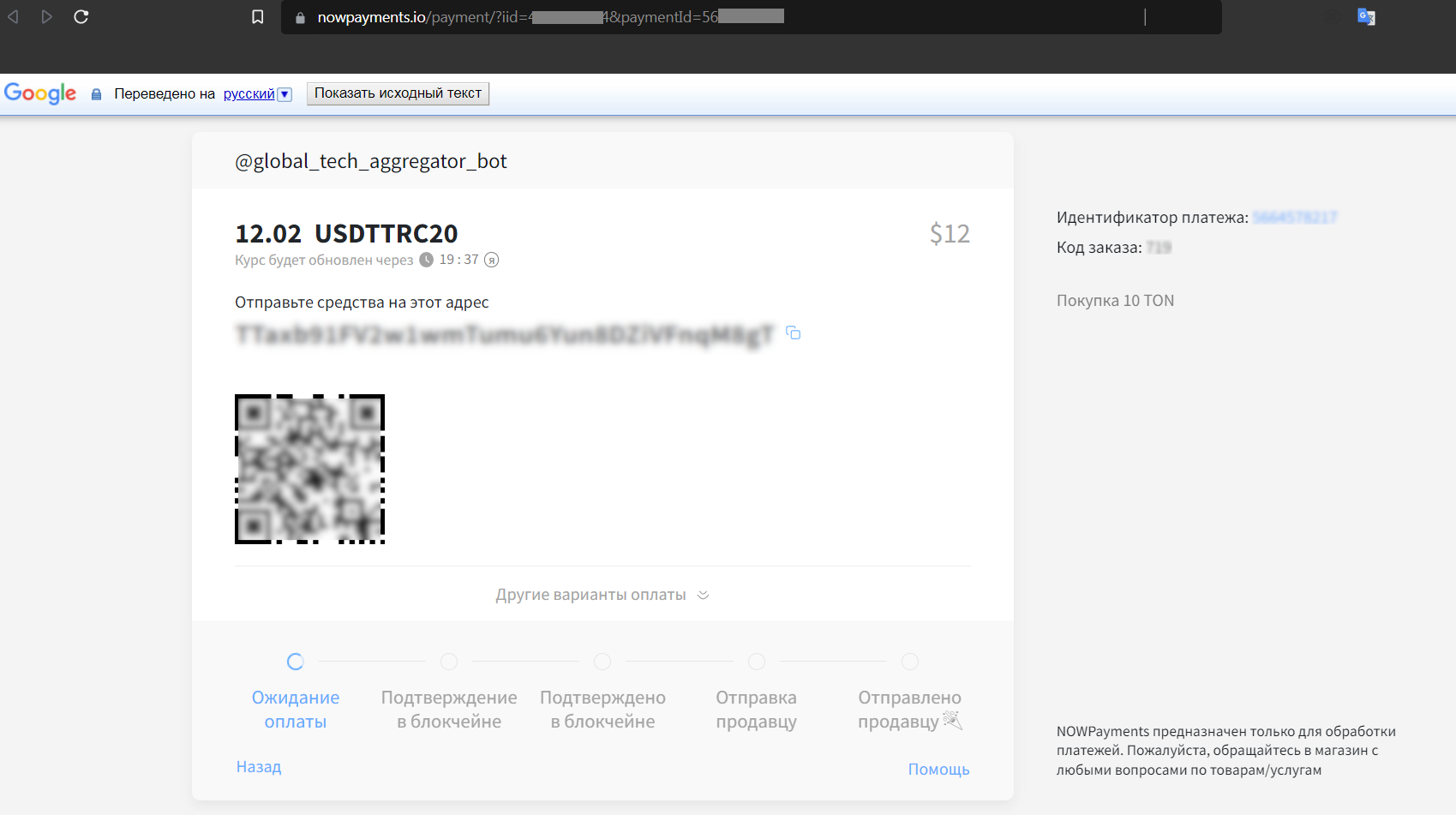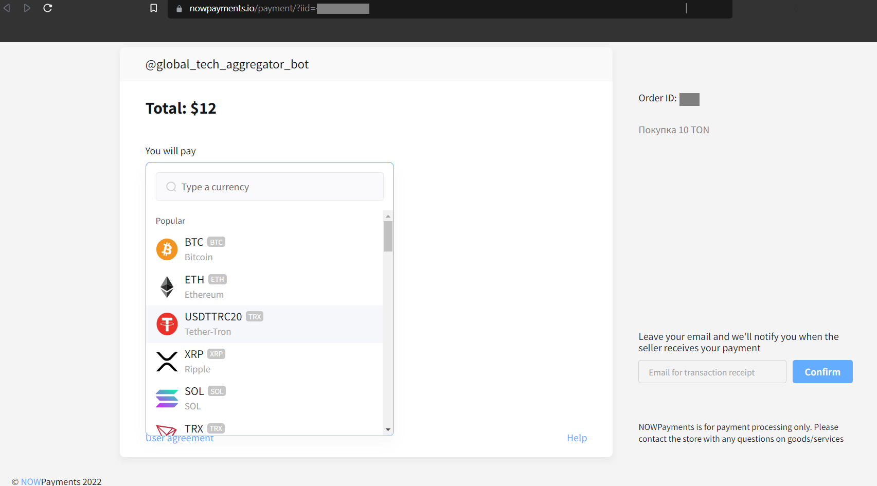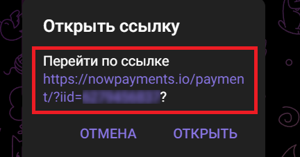 Собственно, пополнение самого лк. Для начала заходим в бота и отправляем ему команду /account. Выбираем пункт "Пополнить кошелек" > Вводим сумму пополнения, после которой выскакивает сообщение с кнопкой "Пополнение кошелька", на которую мы жмем. Открывается сайт (пример https://nowpayments.io/payment/?iid=123456789)