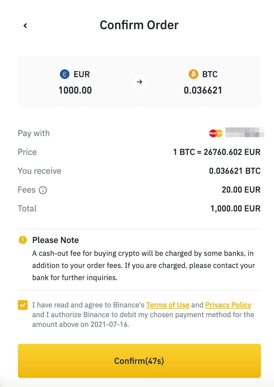 Проверьте реквизиты платежа и комиссию, затем подтвердите операцию в течение одной минуты. Через одну минуту цена и сумма криптовалюты для покупки будут пересчитаны исходя из рыночной цены. Нажмите «Обновить», чтобы уточнить сумму ордера.
