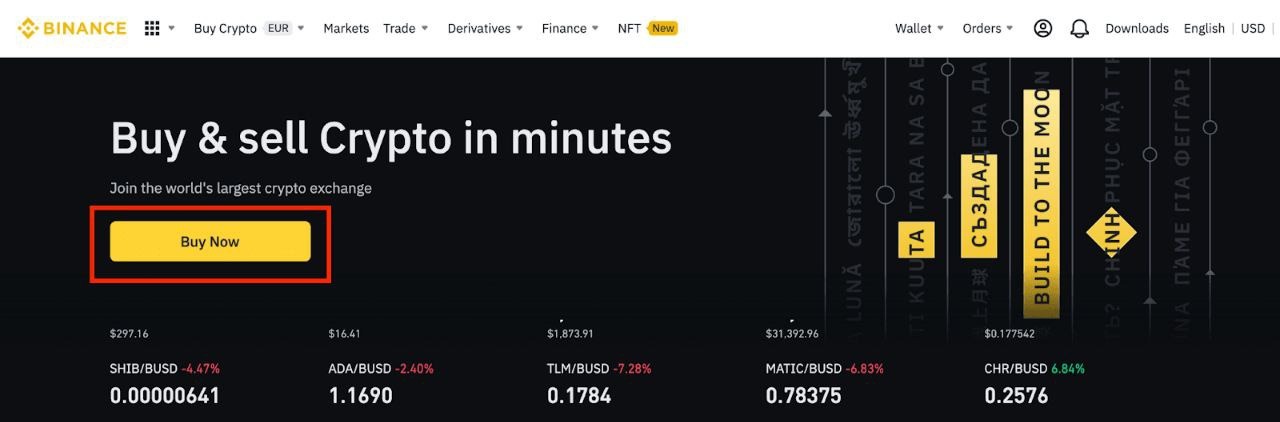 Войдите в учетную запись Binance и нажмите кнопку «Купить сейчас» на главной странице.