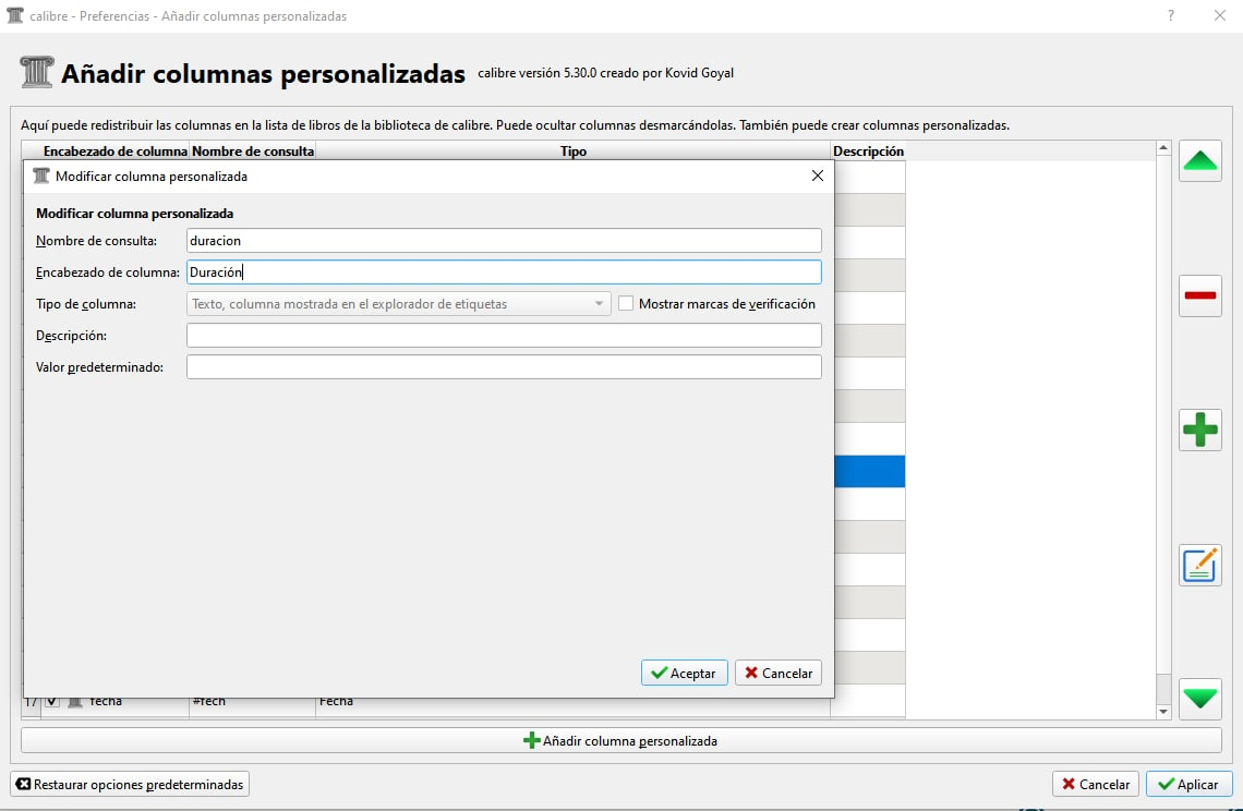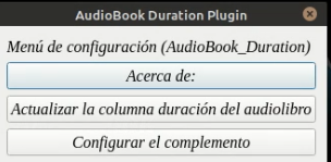 2º Pulsa el botón de nuestro plugin "AudioBook_Duration" sobre el botón de configurar el complemento, y en este campo rellena el nombre de la columna # duración o el nombre que le hayas dado.