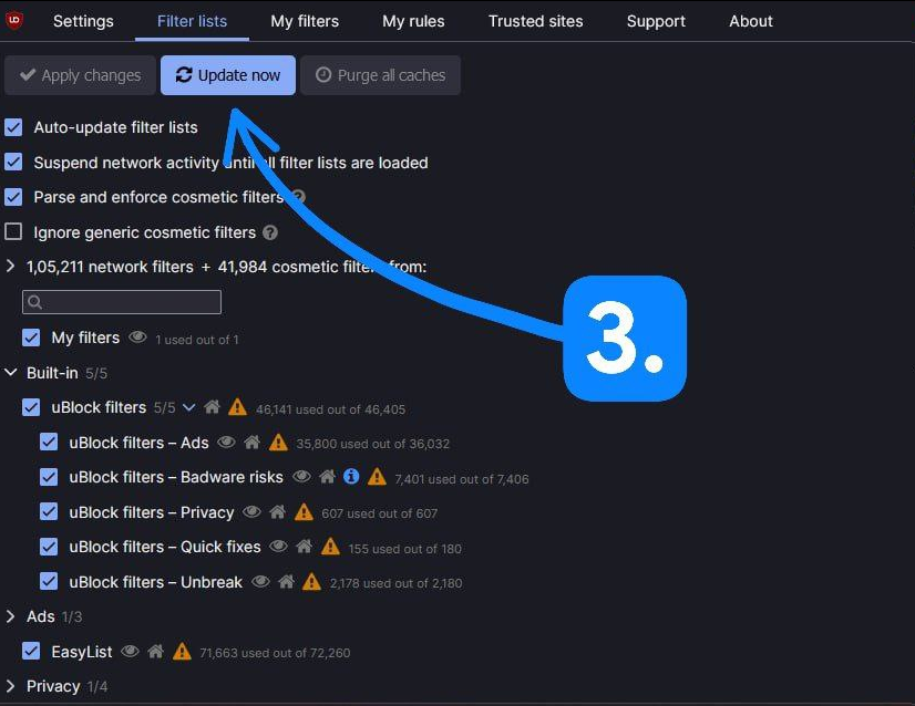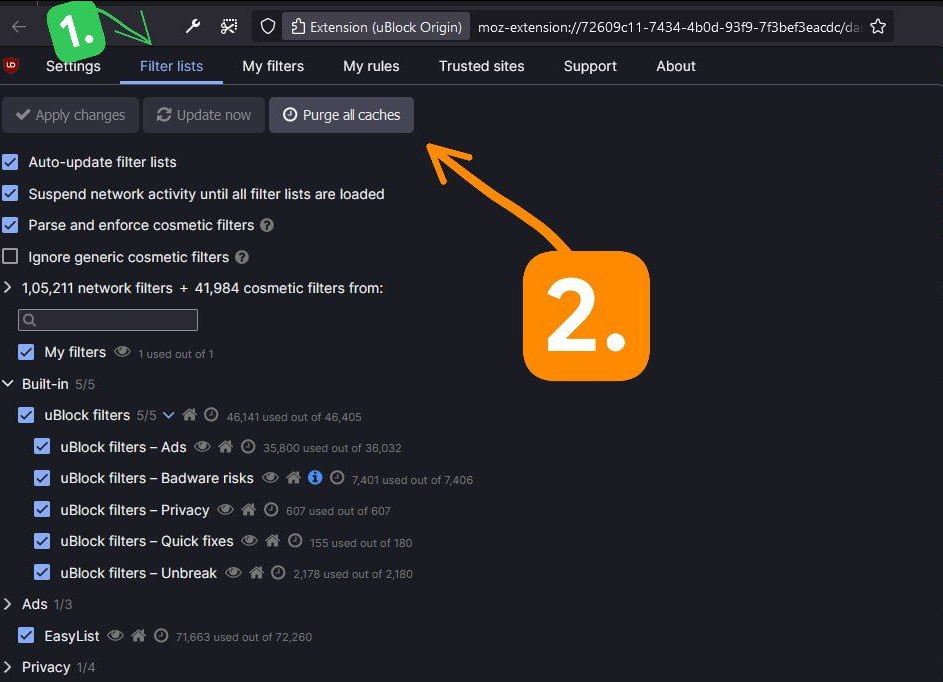 In the Filter lists tab, click on Purge all caches.