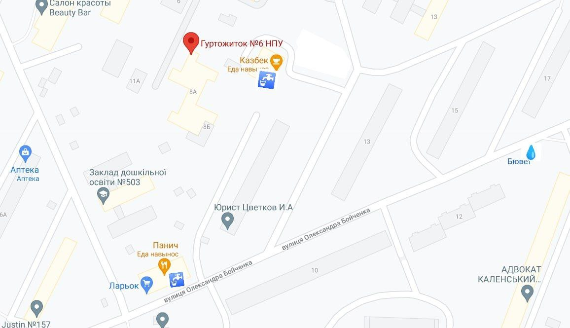 Адреса: м. Київ, Дніпровський район, вулиця Космічна 8А, гуртожиток №6, індекс 02192