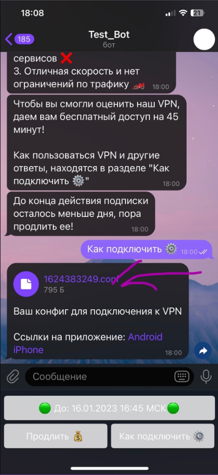 После получения доступа к впн, в боте нажимаем кнопку "Как подключить"