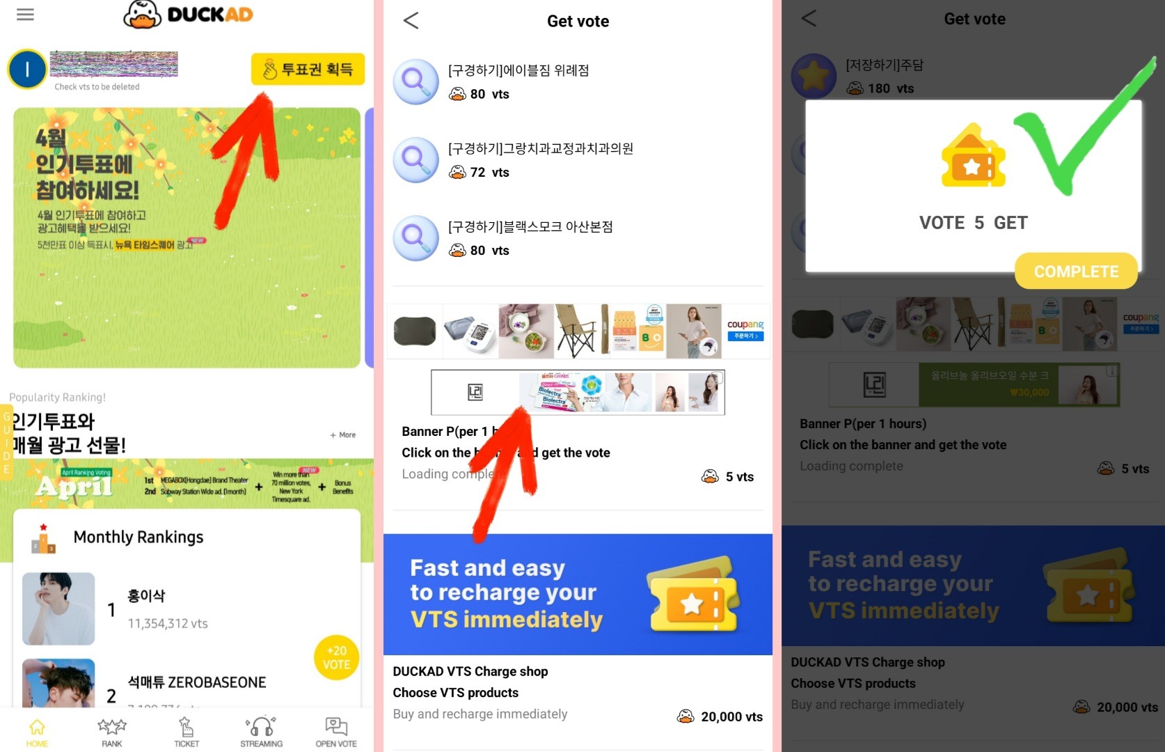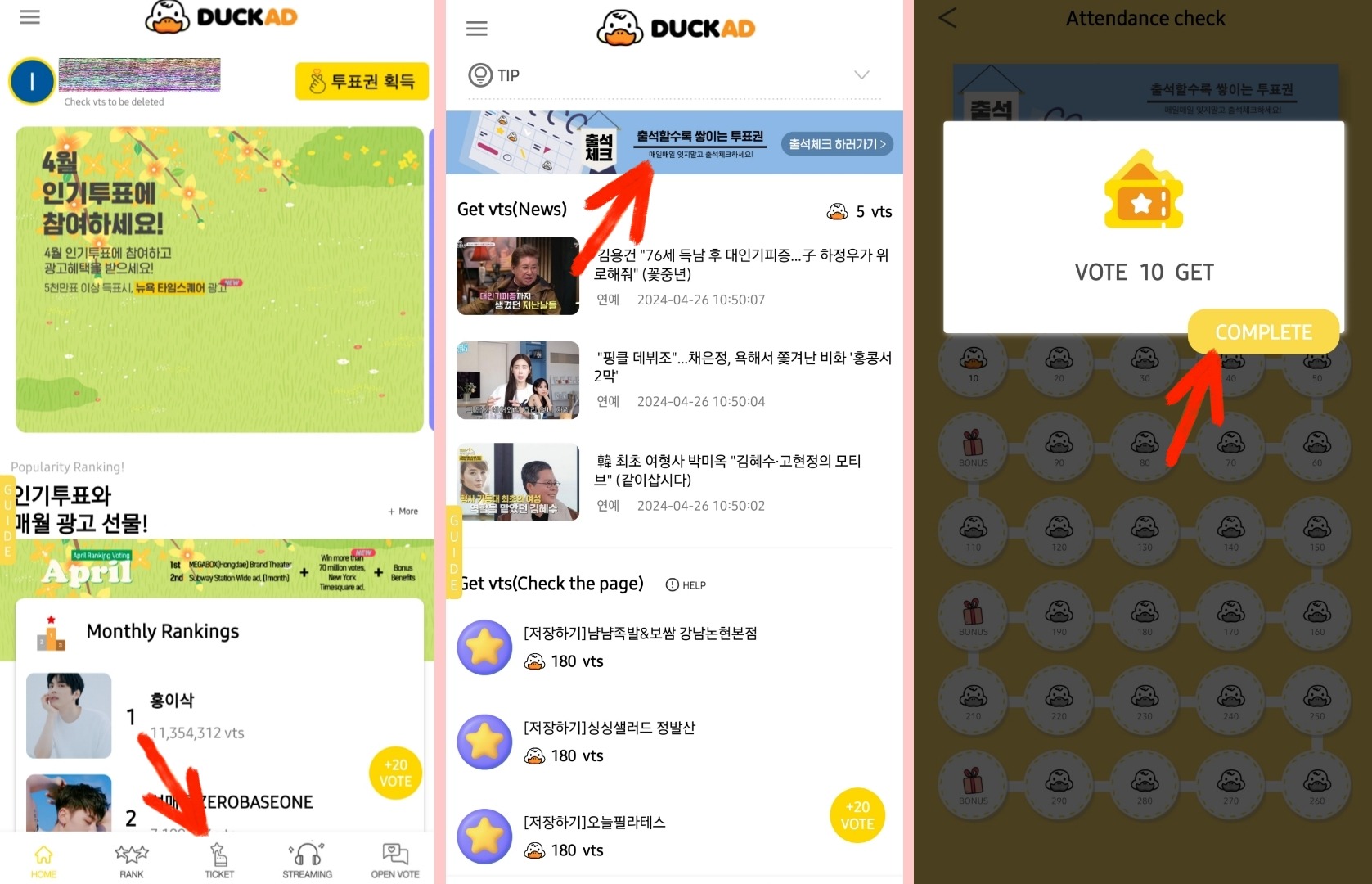- Ежедневная отметка в календаре. Нажимаем на ticket в нижней строке, далее на голубой баннер. Нам дают голоса, нажимаем на complete, забирая их.