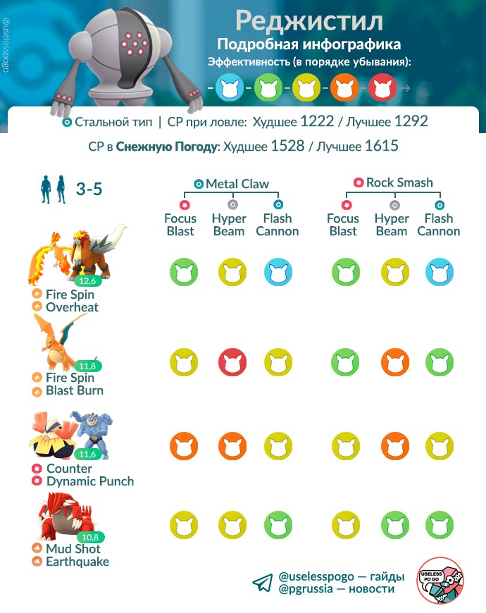 Реджистил получил отличную быструю атаку Metal Claw, но это не исправляет ситуацию с его отвратительными характеристиками. 2261 CP — для легенды это звучит просто смешно.