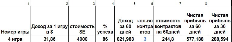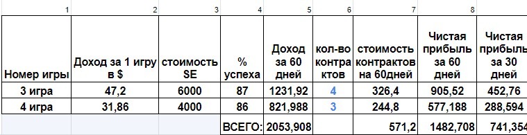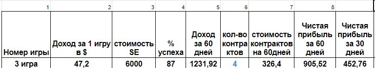 - Таблица расчёта доходности от игры