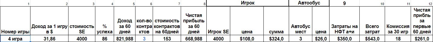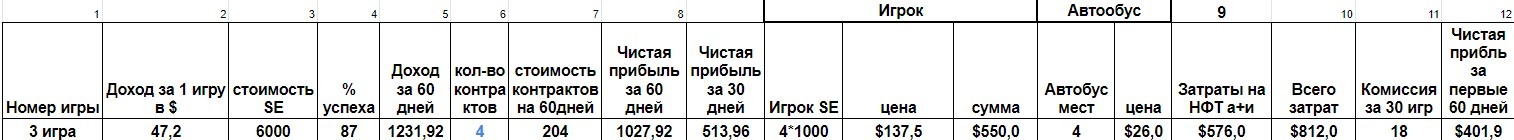 Что бы сделать команду для Игры 4 мне понадобилось 3 игрока-324$, автобус 3-х местный стоил 26$, ещё 40$ надо застейкать в пуле под 67% годовых, ещё я купил 3 контракта на 2 мес, по 51$ каждый*3 игрока=153$. Итого затрат вышло на ~543$+купил BNB на комиссии. Сейчас что бы зайти в эту игру вам будет нужно около 700$, из-за роста цен на персонажей. С февраля ещё дороже, так как контракты подорожают.