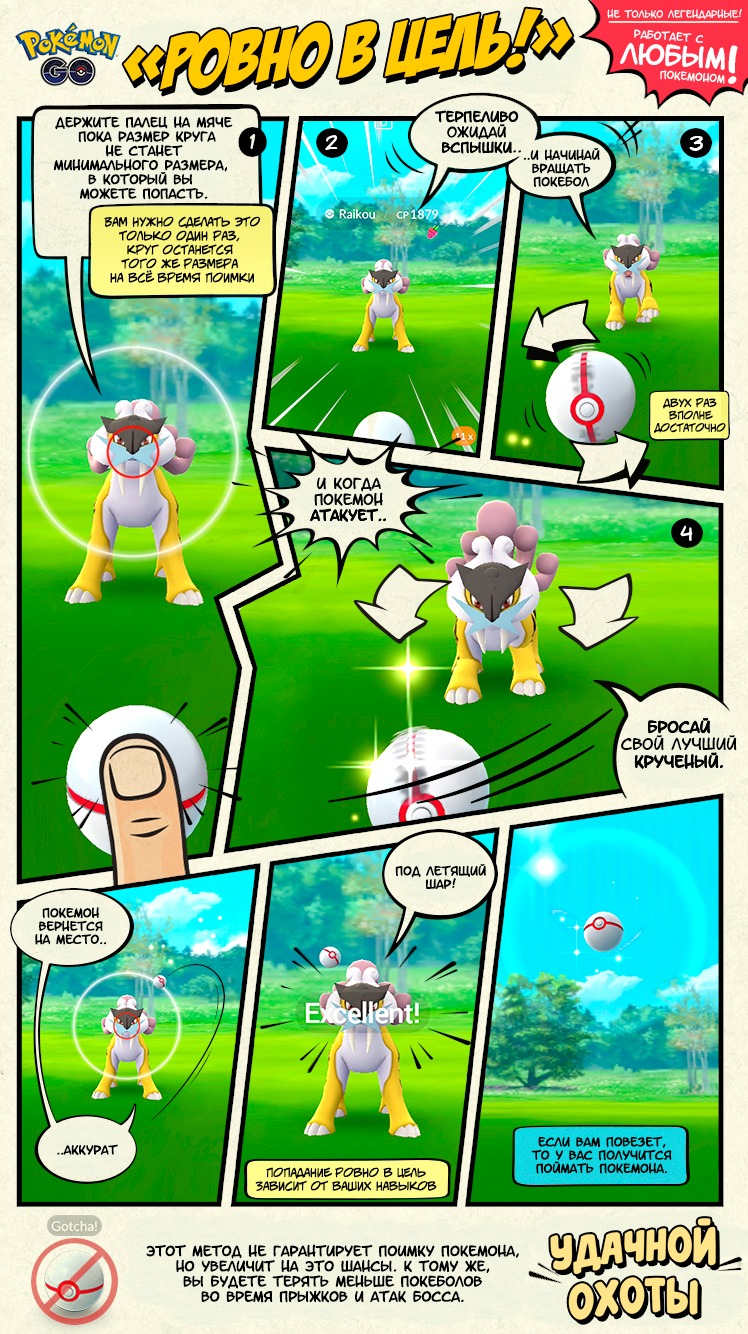 - Сделать кручёный Excellent. Проще всего это сделать на покемонах с большим кругом ловли. Часто, но не всегда под эти условия подходят легендарные покемоны и старшие формы обычных покемонов. А с техникой броска поможет вот эта картинка: