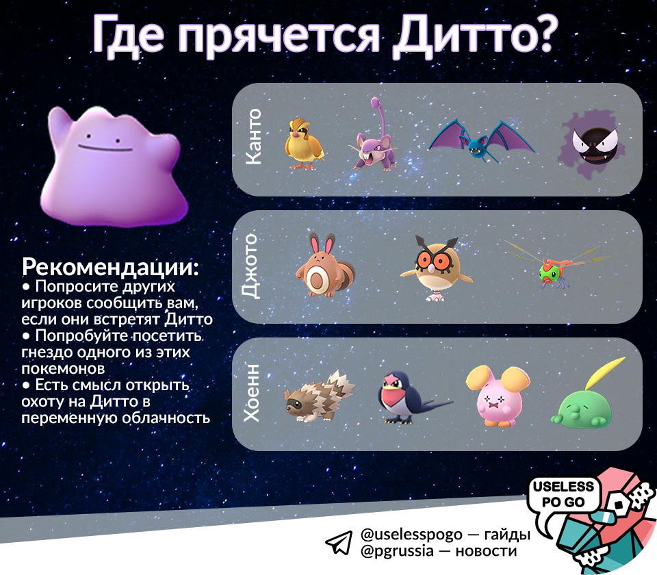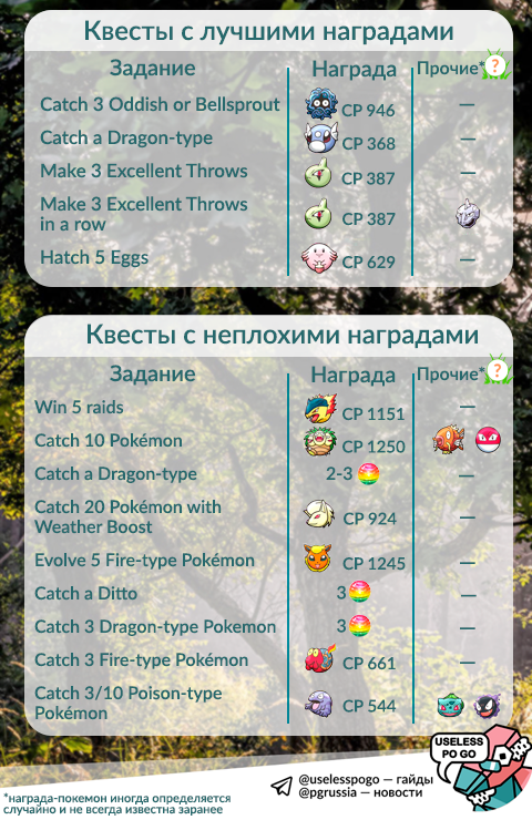 Большая часть известных квестов не представляет особо интереса, но некоторые предлагают очень редкие и желанные награды. Поэтому вместо того, чтобы приводить множество огромных таблиц со всеми квестами, мы сделали компактную инфографику, где перечислены все задания, за выполнение которых вы можете получить рейркенди, старшую форму покемона, или покемона, которого нельзя найти на гнёздах.