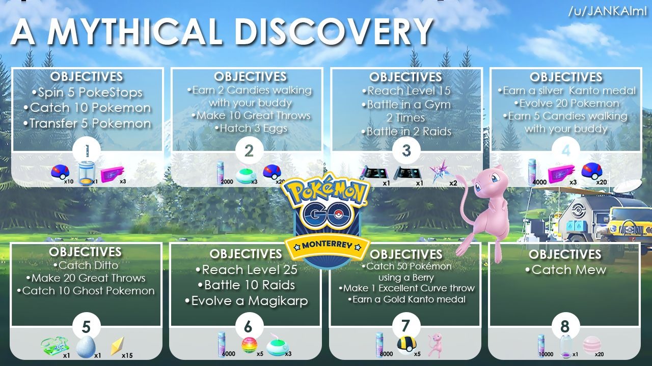 Пока в игру введена только одна цепочка квестов — на получение Мью. Она становится доступна по достижению 5 уровня.