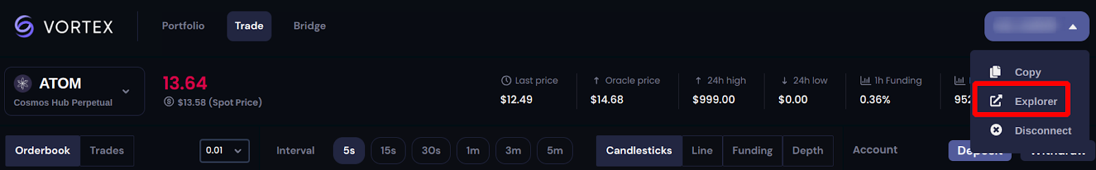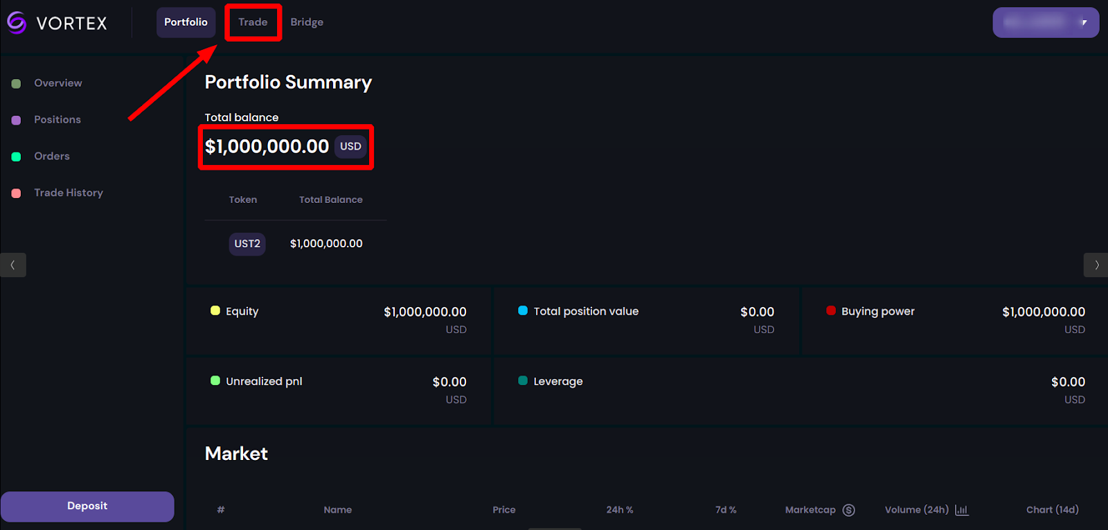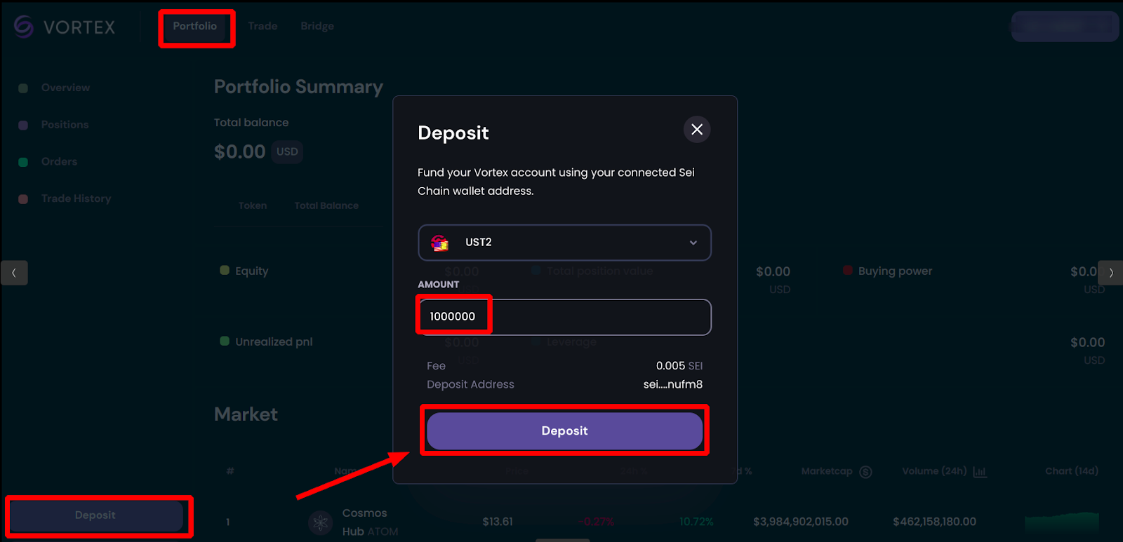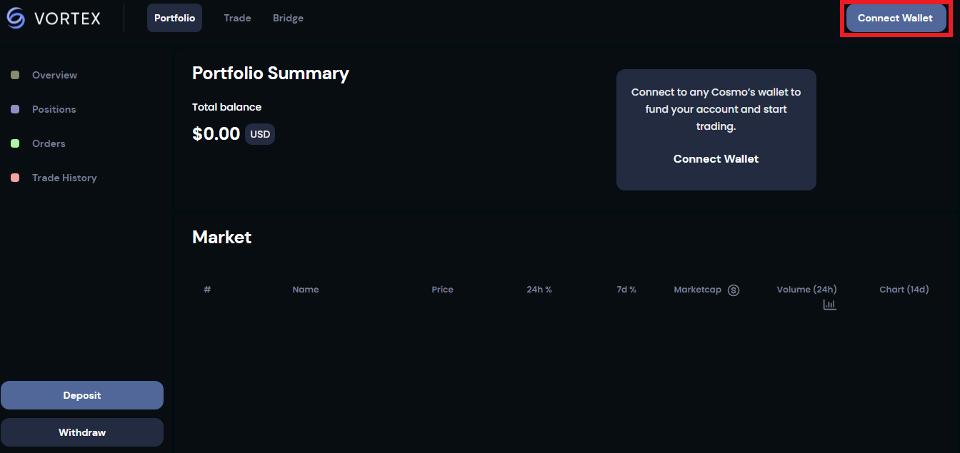 1. Переведите токены из вашего кошелька в Vortex Protocol. Нажмите кнопку [Deposit] на вкладке [Portfolio]