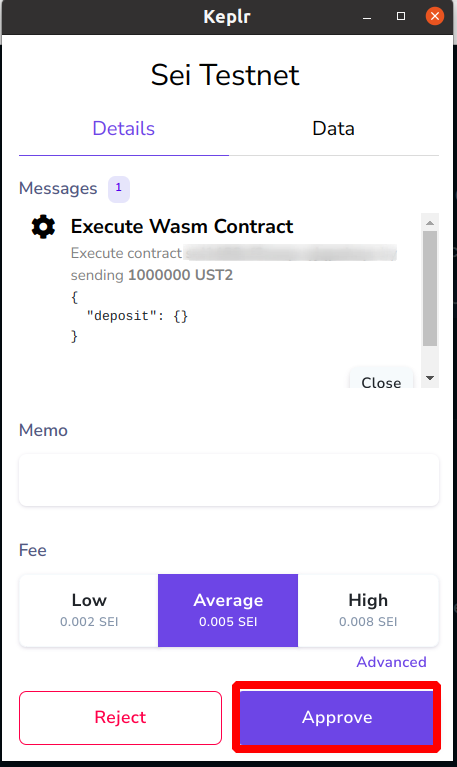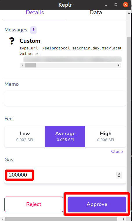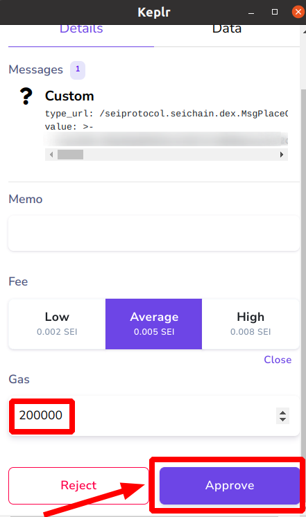 7. Укажите плату за газ [200000] и нажмите [Approve]
