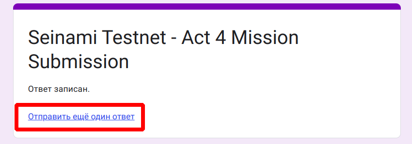 21. После завершения каждой миссии нужно заполнять форму [Seinami Testnet — Act 4 Mission Submission] по ссылке https://docs.google.com/forms/d/e/1FAIpQLSco2P67lVl30HiwTQyRvzetdst7aMQM3RYQk3kKfI2iTeZQKQ/viewform