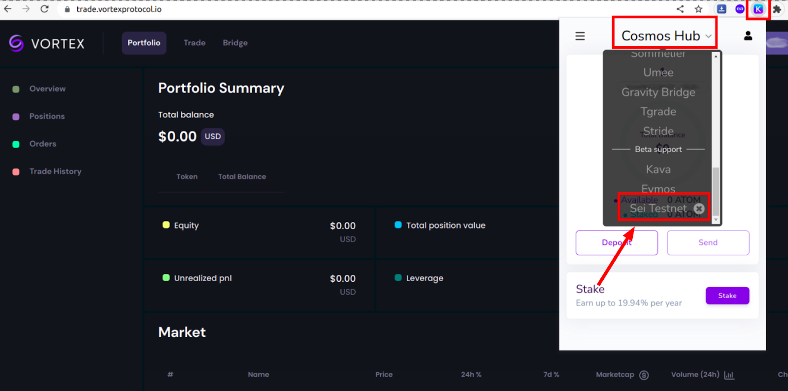 8. Ваш кошелек подключен к сайту Vortex Protocol. Выберите в кошельке Keplr сеть [Sei Testnet]