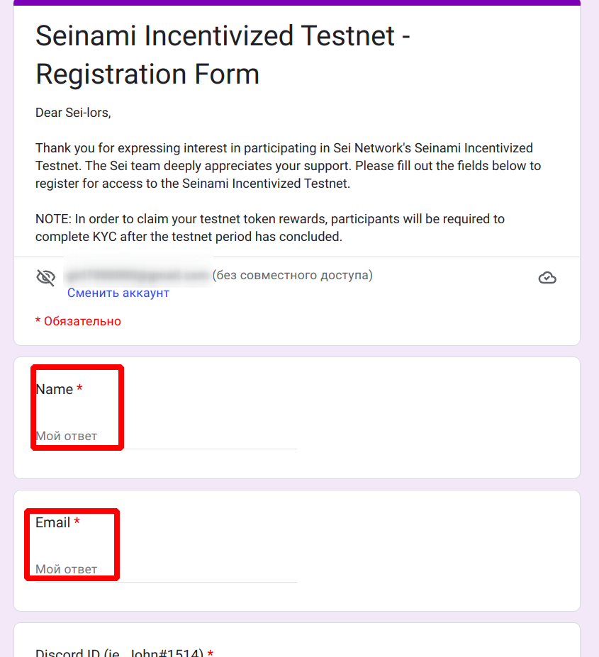 16. Заполните регистрационную форму [Seinami Incentivized Testnet — Registration Form] по ссылке https://docs.google.com/forms/d/e/1FAIpQLSfD-FWT3VrxtYAAmUiwwX5Zbw3mzkZoT6pV0ZAXYqu1yUNtEw/viewform