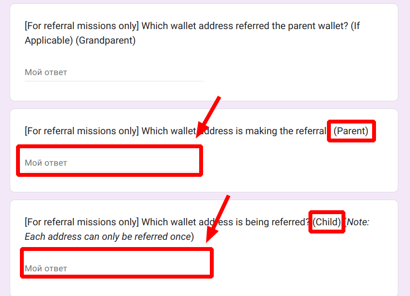 Если приглашенный вами друг (которого вы ранее в миссии 6 указывали в поле [Child] формы) также пригласил своего друга, то вам также нужно заполнить форму https://docs.google.com/forms/d/e/1FAIpQLSco2P67lVl30HiwTQyRvzetdst7aMQM3RYQk3kKfI2iTeZQKQ/viewform, теперь ваш адрес становится прародительским, ваш друг родительским, а его друг - дочерним. Соответственно в форме нужно указать: