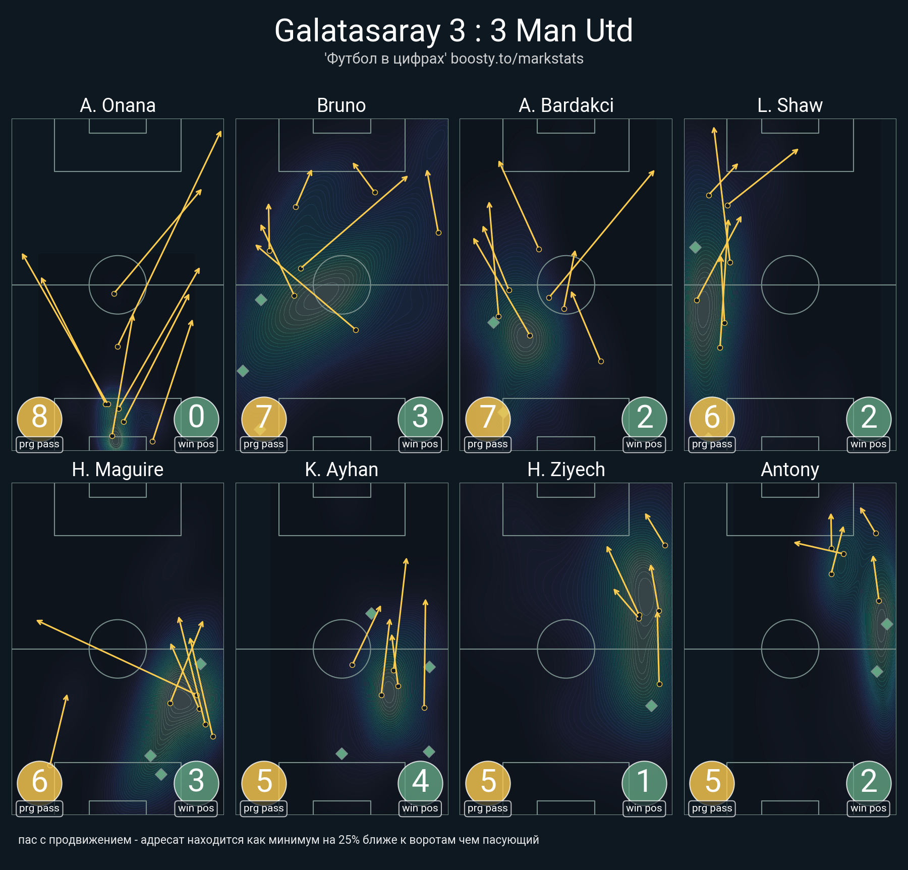 30 успешных передач из 47 попыток (1 ассист, 3 под удар, 7 с продвижением, 8 на трети соперника)