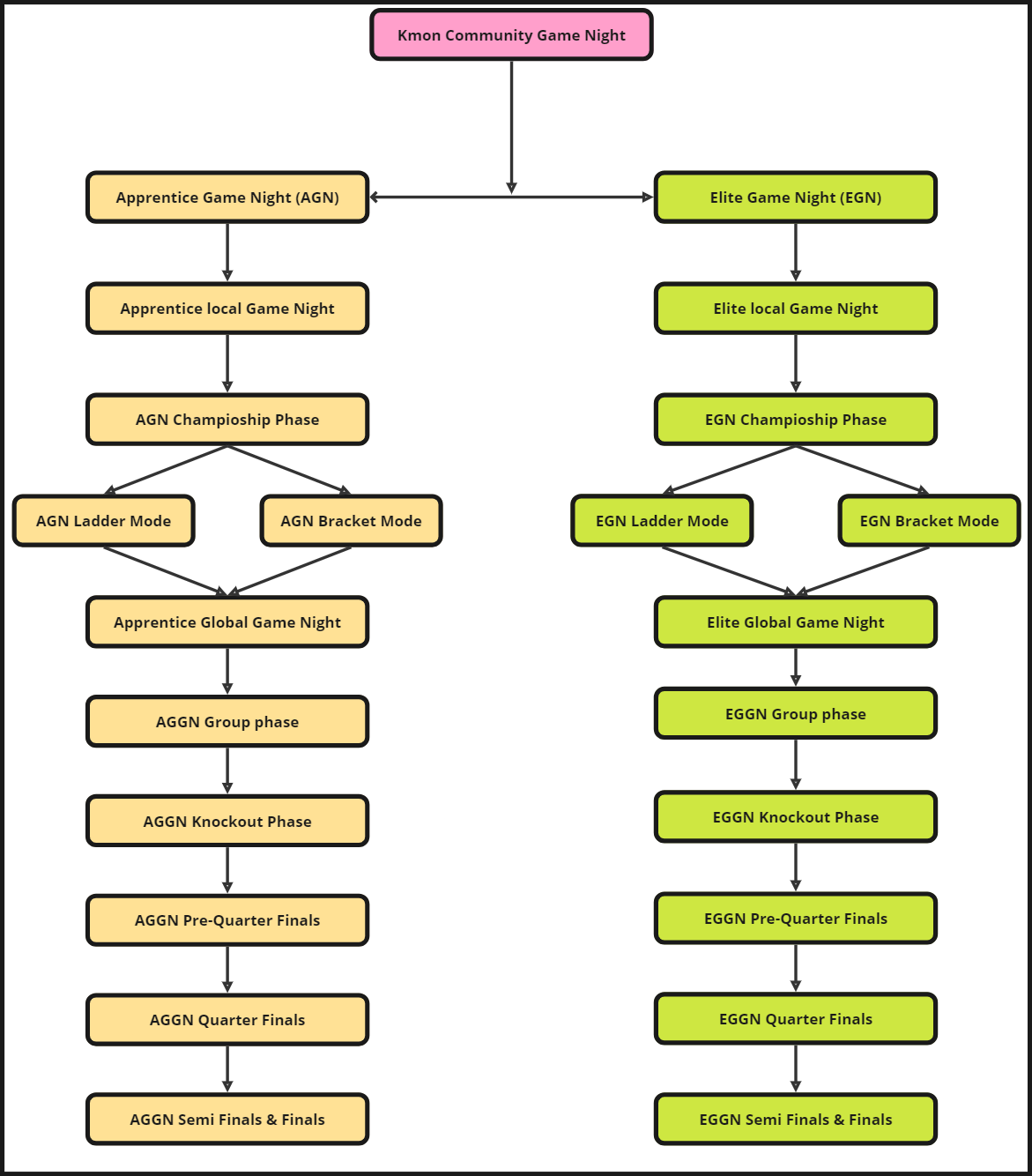 Note: In both EGN and AGN, the Knockout Phase will differ between communities with 9 or less participants, and communities with 10 or more participant players.