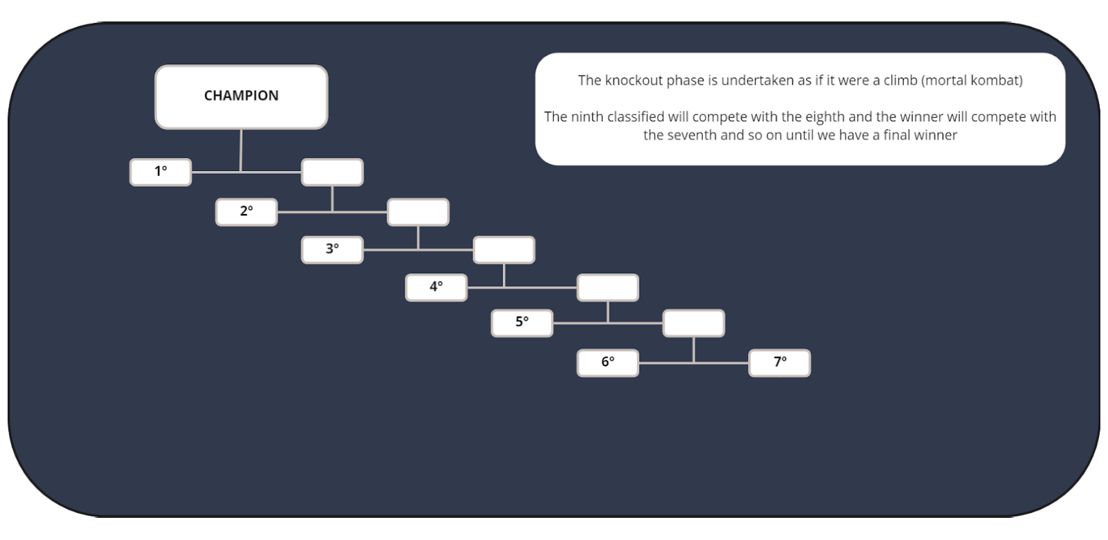 2). Knockout Stage with 9 or less participant players: In this phase, a maximum of the top 7 players in the championship ranking will qualify for the direct elimination phase which works as a climb towards the top (Mortal Kombat style).