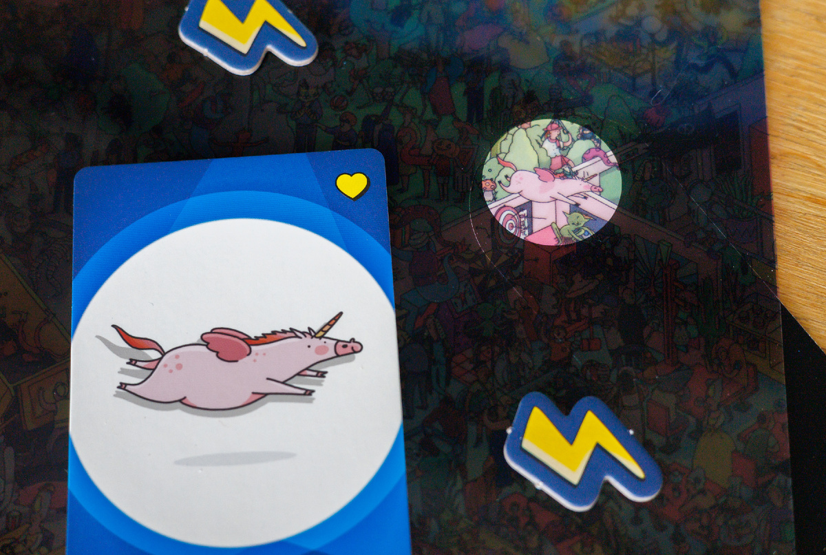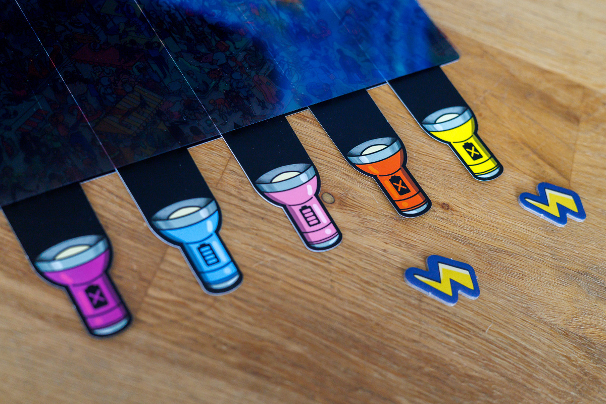 Фонарик подсвечивает фрагмент изображения под прозрачным слоем с чёрной подложкой, создавая эффект настоящего светового луча. За 60 секунд нужно найти всех персонажей и указать их точное количество на специальном диске. Например, 5 единорогов или 10 волшебников. У каждого свой планшет с уникальным наполнением, но одинаковым количеством персонажей на картинках.