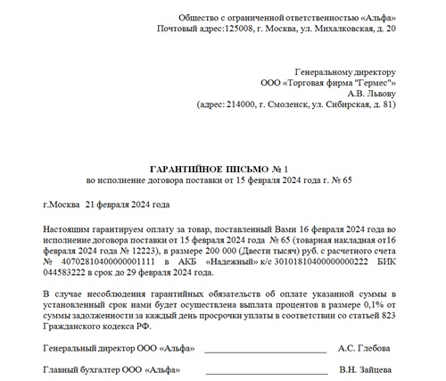Гарантийное письмо содержит