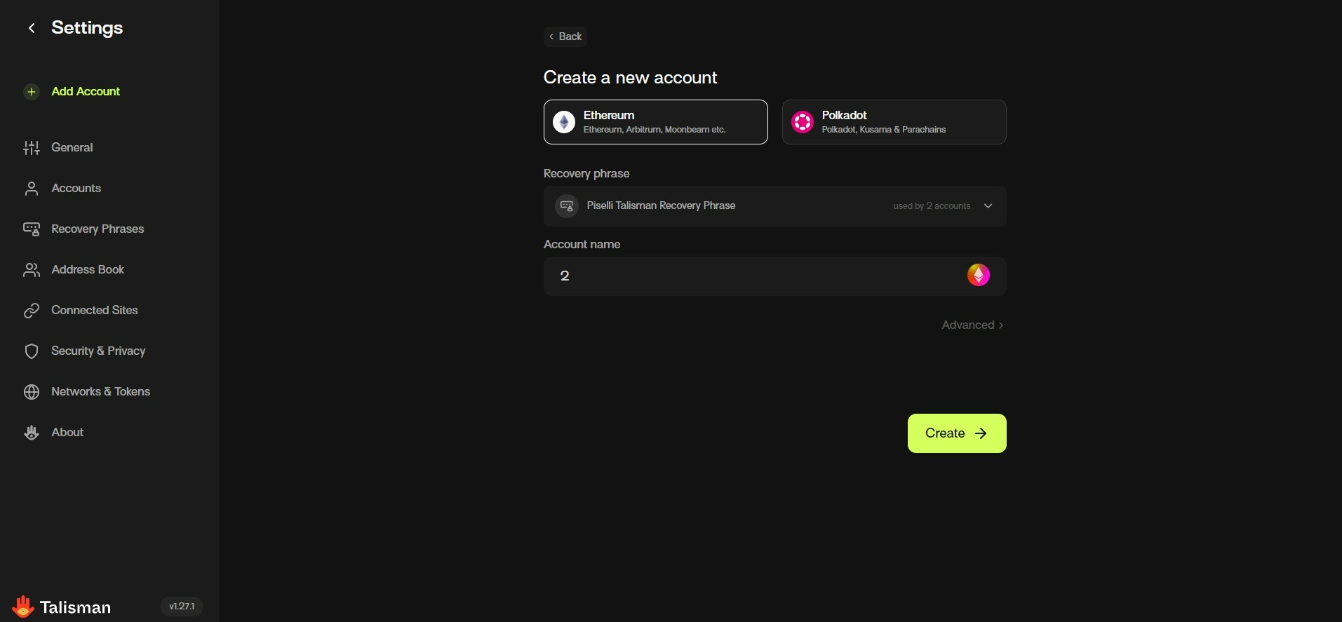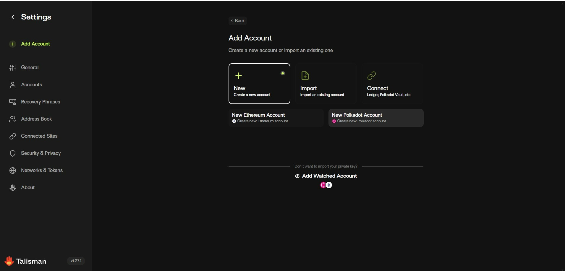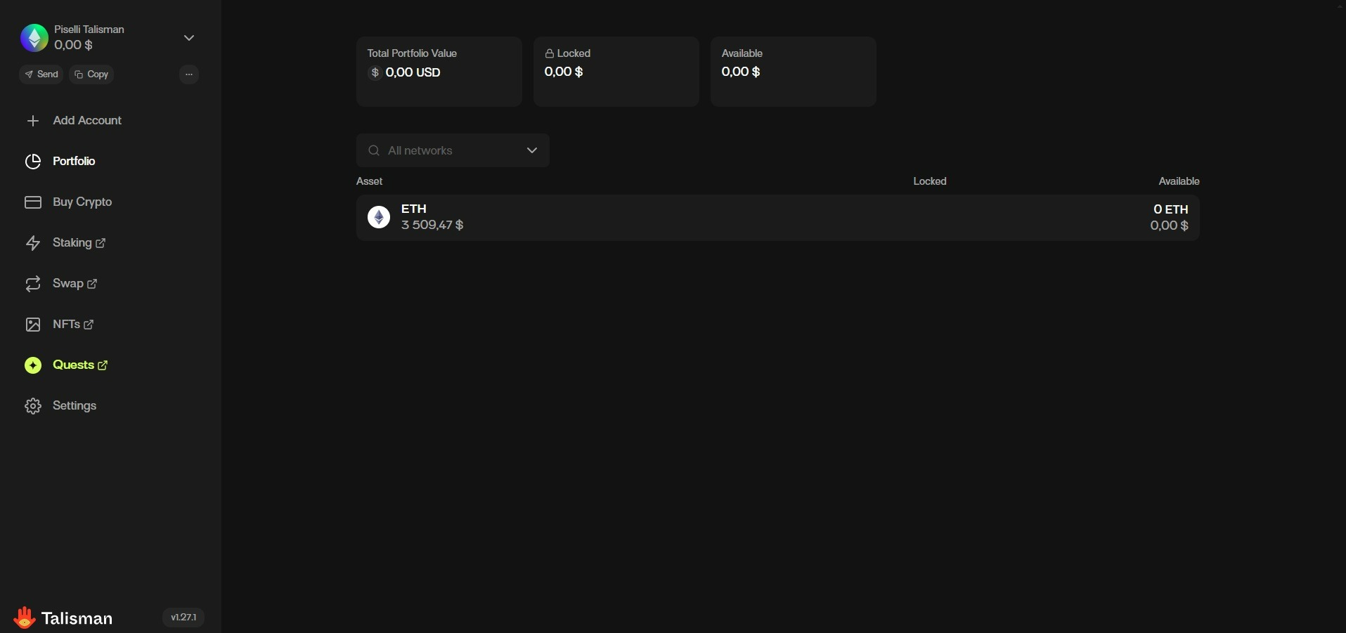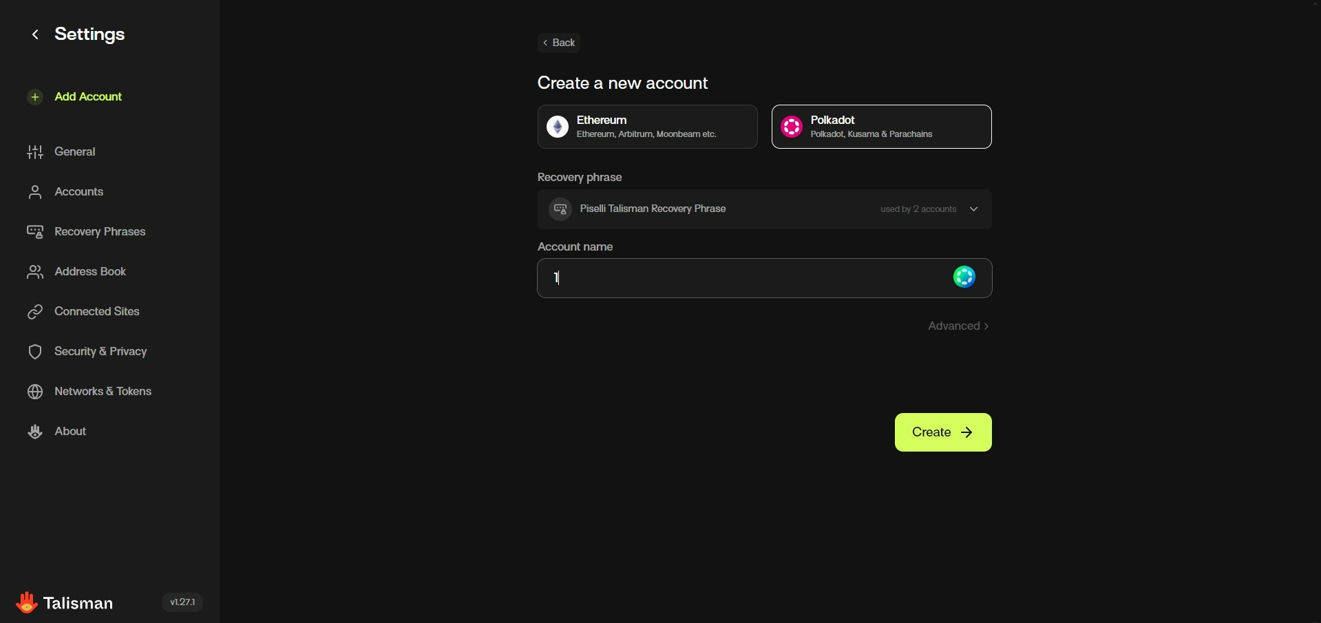 Далее, выбираем Talisman который мы добавили и в нём нужно, чтобы была сеть Polkadot. Для этого заходим в наш Talisman.