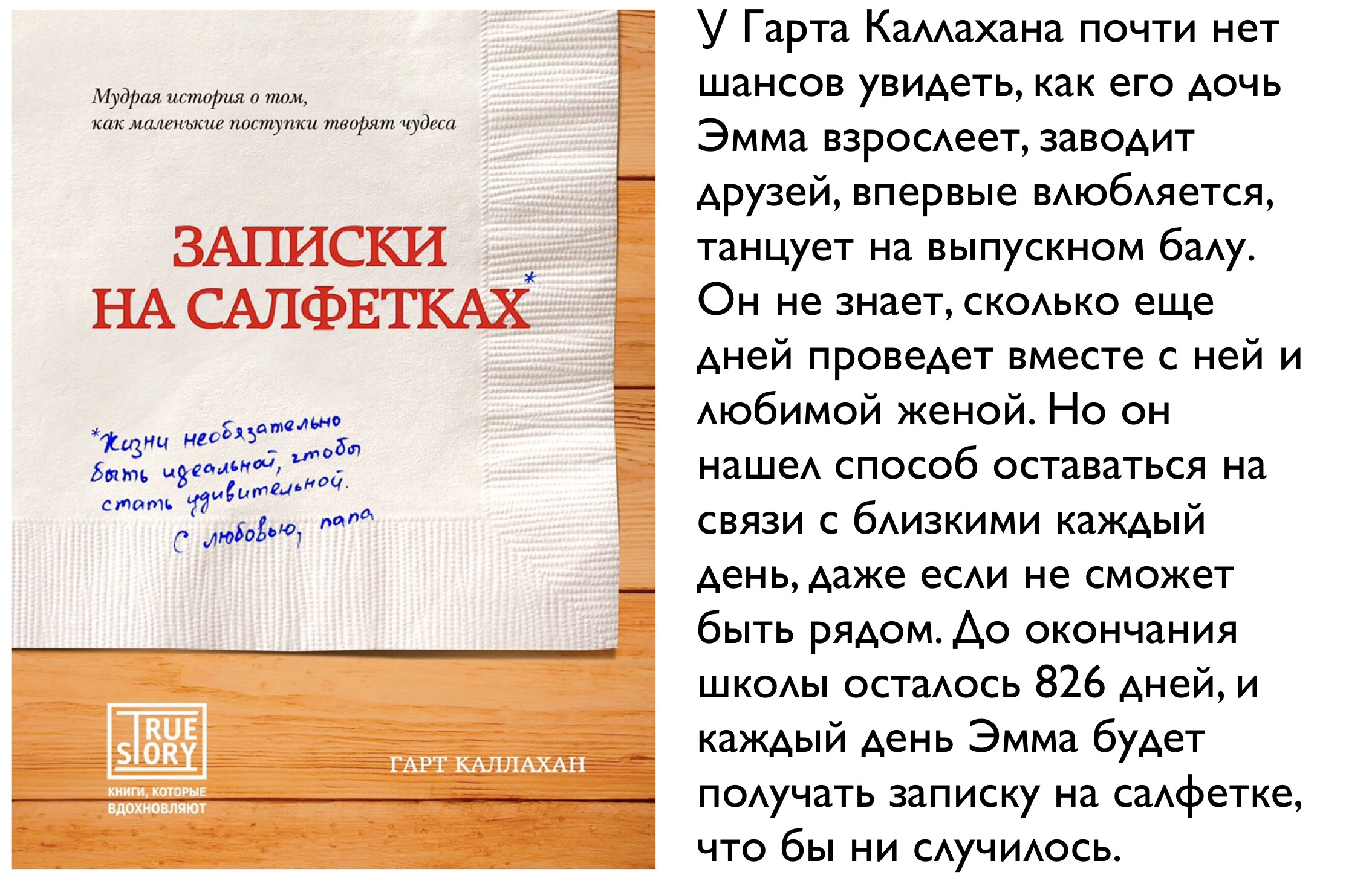 Так что мне пришлось найти другой путь. Я не знаю, сколько времени у меня осталось. Но я нашел способ каждый день давать ей знать, как она любима, как горячо я ее поддерживаю и как мне небезразлична та личность, которой она становится. Я пишу ей записки на салфетках, которые каждый день кладу в ее сумку с обедом.
