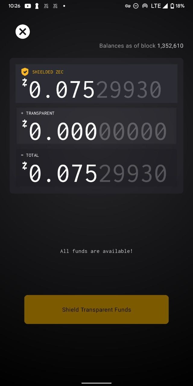 - Посмотреть доступный баланс адресов. Кнопка “Shield transparent funds” автоматически переведет все монеты с публичного адреса на ваш защищенный