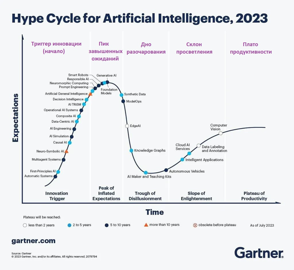 🚫 Также стоит отметить, что на графике нет ни одного значка с красным крестом. Так Gartner обозначает предположительно мертворождённые технологии, которые могут даже вызвать ажиотаж, но умрут, не дойдя до "плата продуктивности". Со временем успех ожидается по всем фронтам.