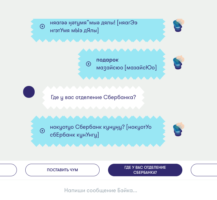 Пока в интерфейсе есть возможность выбрать какую-нибудь бытовую фразу на языке из предложенных или пообщаться в чате с виртуальным помощником, которого зовут Бэйка. По сути чат работает как переводчик.