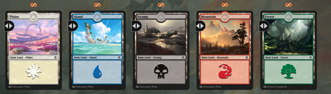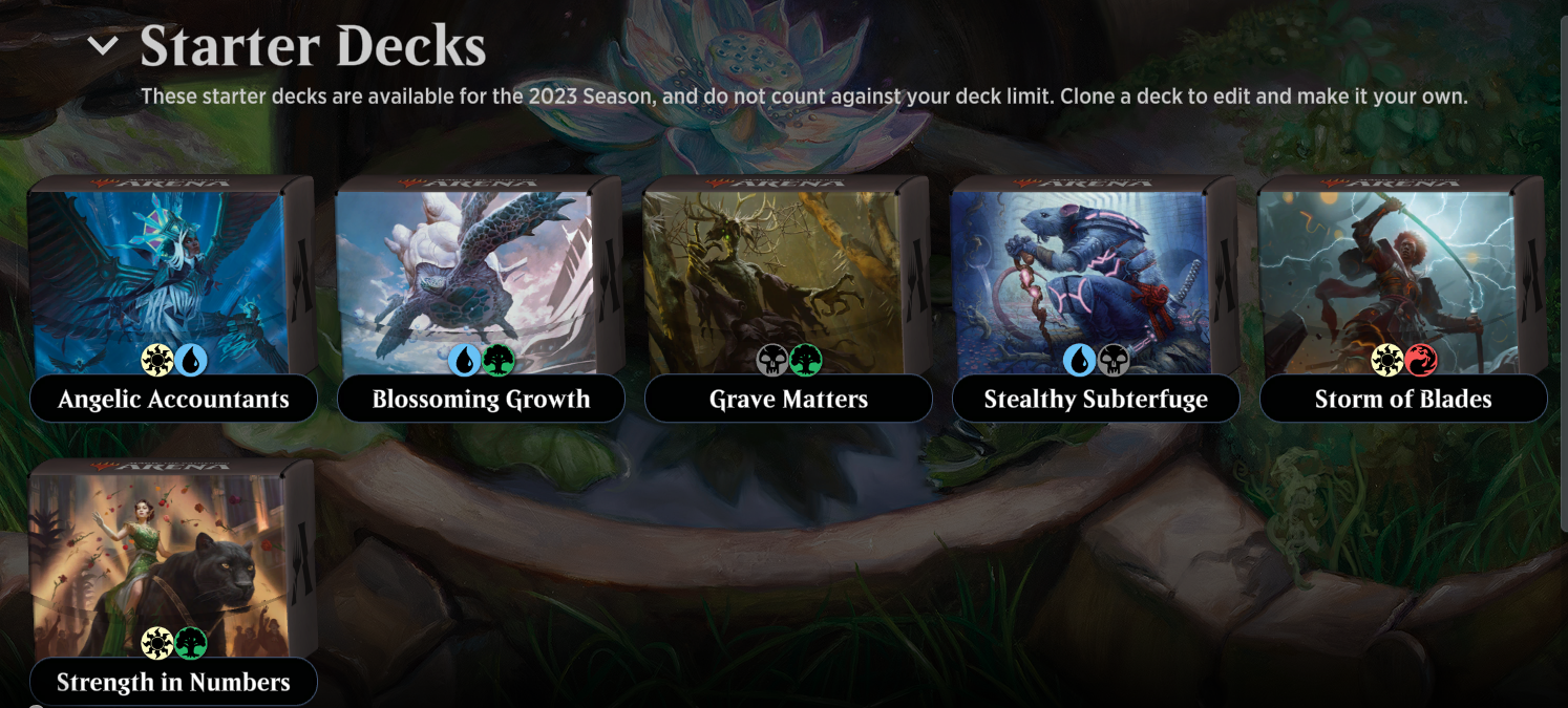 На старті вам доступні декілька колод з різним поєднанням кольорів та стратегій для початку вашої подорожі в світі Магії. Є два способи поповнити колекцію "бустерами" (наборами з 15 карт у настільній грі або 8 карт в електронній). Перший спосіб – введення спеціальних промокодів, присвячених виходу нового випуску карт. Другий – прогрес батл пасів або віртуальна валюта. Є безкоштовний батл пас – Set Mastery, а є преміальний – Mastery Pass. Віртуальною валютою ж виступають золото та самоцвіти. Якщо золото можна отримати при виконанні щоденних завдань та перемог, то самоцвіти – це преміальна валюта, яку можна купити в магазині, виграти в івентах чи отримати на певних етапах Mastery Pass.