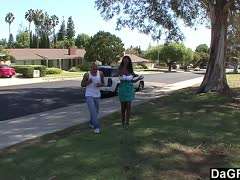 Im Freien melkt die Hausfrau sein Sperma raus
