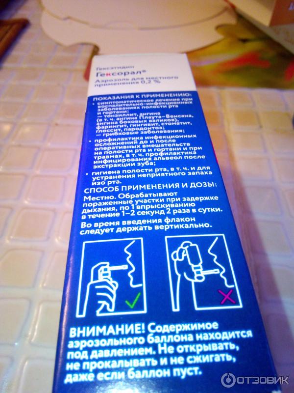 Обуславливается это внушительным перечнем противопоказаний Гексорала, а также его высокой аллергенностью, наличием в составе этилового спирта и веществ, токсичных при попадании в пищевод или бронхи . Следует подчеркнуть, что Гексорал в аэрозоле содержит в 3 раза больше алкоголя, чем в растворе для полоскания .