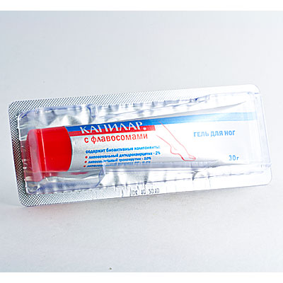 Гель Капилар - наружное средство, отлично себя зарекомендовавшее при терапии сосудистых заболеваний нижних конечностей, особенно варикоза . В своем составе медикамент содержит флавосомы - природные вещества, способствующие укреплению сосудистых стенок, нормализации венозного и капиллярного кровотока, увеличению числа действующих капилляров .