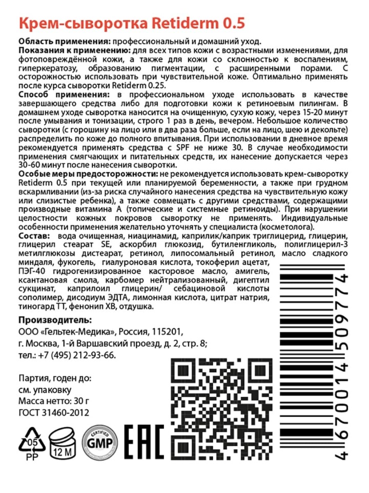 Сыворотка для лица с ретинолом Retiderm 0 .25 / против морщин / Ретидерм, 30 мл Гельтек 11991540 в интернет-магазине Wildberries . Бесплатная доставка и постоянные скидки!