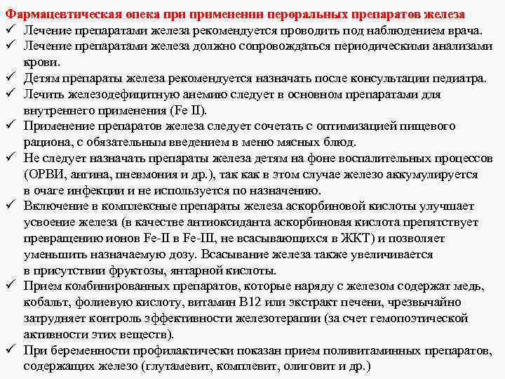 С осторожностью: одновременное применение препаратов железа с диетическими продуктами и добавками, содержащими соли железа (возможный риск передозировки); пациенты с воспалением и язвами слизистой оболочки ЖКТ (следует оценивать соотношение пользы от лечения и риска развития обострений гастроэнтерологических заболеваний на фоне терапии препаратами железа).