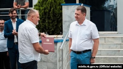Генеральный продюсер «ТРК Крым» Олег Крючков и министр внутренней политики, информации и связи российского правительства Крыма Михаил Афанасьев (слева направо) на церемонии вручения . . .