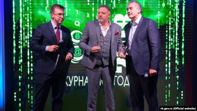 Генеральный продюсер телеканала «Крым 24» Олег Крючков (в центре) с российским главой Крыма Сергеем Аксеновым (справа)
