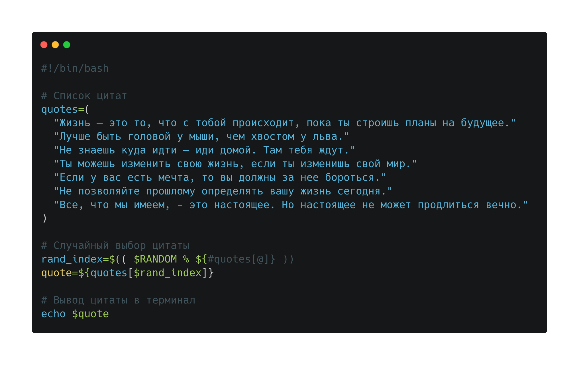 За что отвечают строки этого скрипта? Вначале мы создаем массив со списком цитат, затем используем функцию рандомной генерации номера в пределах количества элементов массива и в переменную quote помещаем элемент массива под сгенерированным рандомным номером. Командой echo переменная quote выводится в терминал.