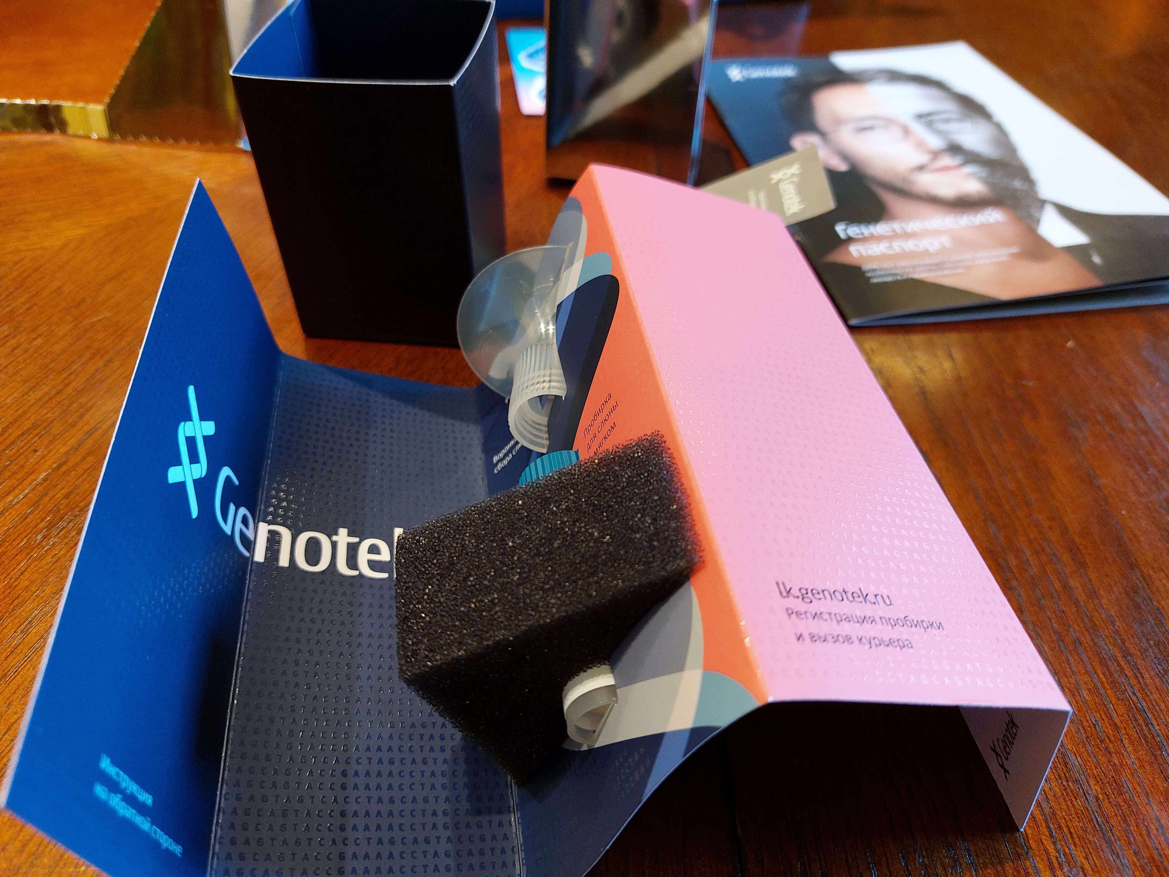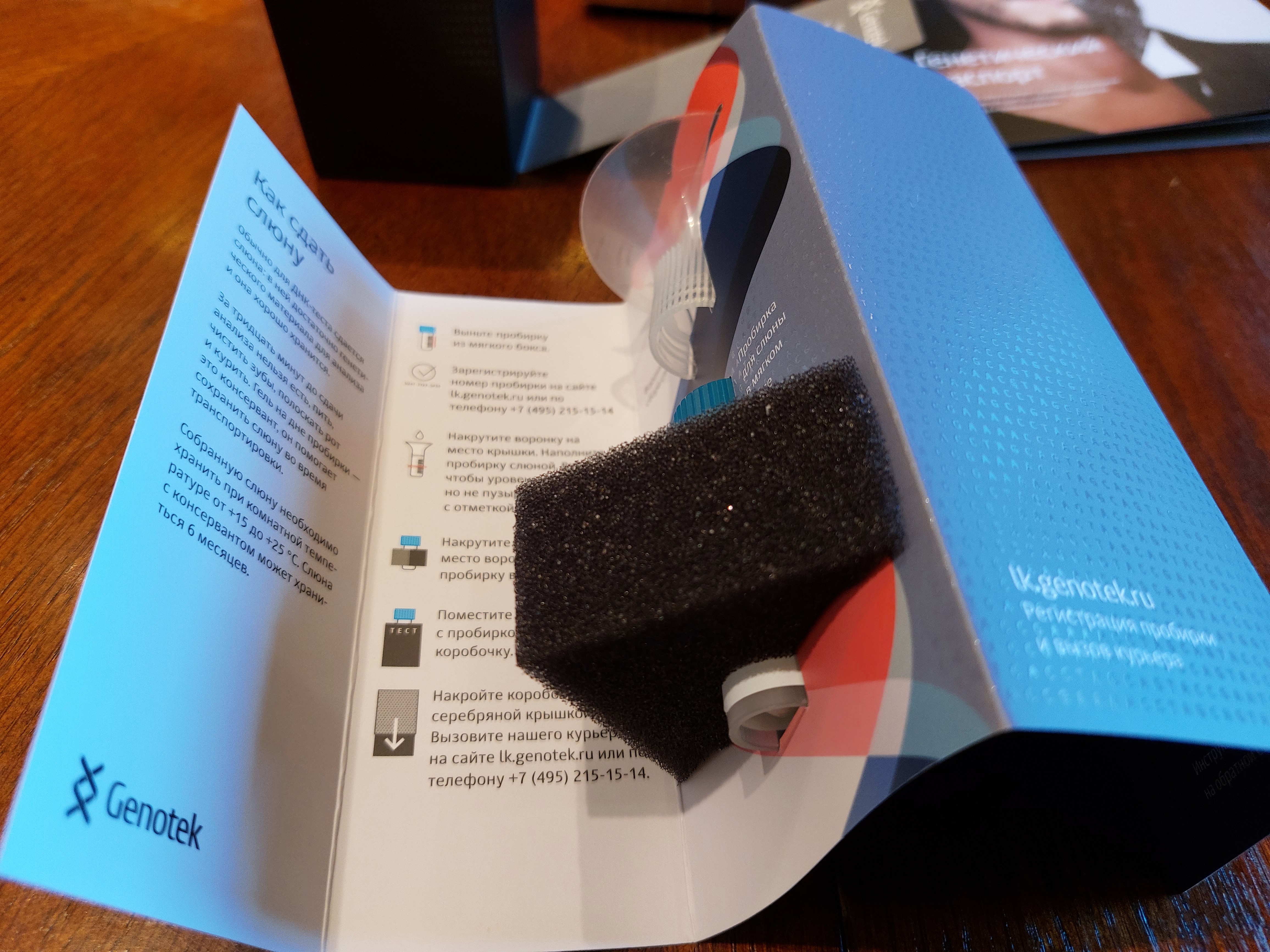 Коробочка достаточно легко открывается, внутри находится инструкция и пробирка. Процесс забора биоматериала достаточно прост: нужно 30 минут не есть, не пить, не чистить зубы, и не курить, после чего наполнить пробирку своей слюной (в этом поможет воронка) выше указанного чёрным уровня. Внутри пробирки находится и консервант, позволяющий сохранять образец некоторое время.