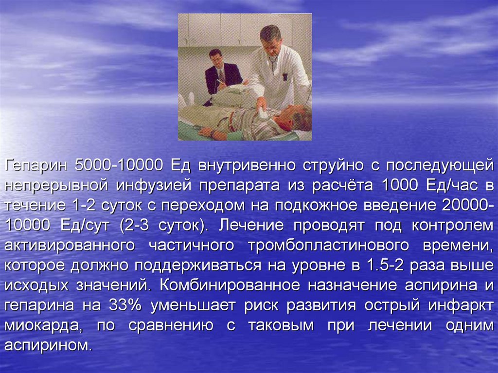 Для предупреждения тромбоза гепарин вводится подкожно в области живота по 1 мл (5000 МЕ) 2 раза в сутки . При кардиомиопатии, сердечной недостаточности и инфаркте миокарда гепарин вводится по 2 мл (10000 МЕ) 2 раза в сутки .