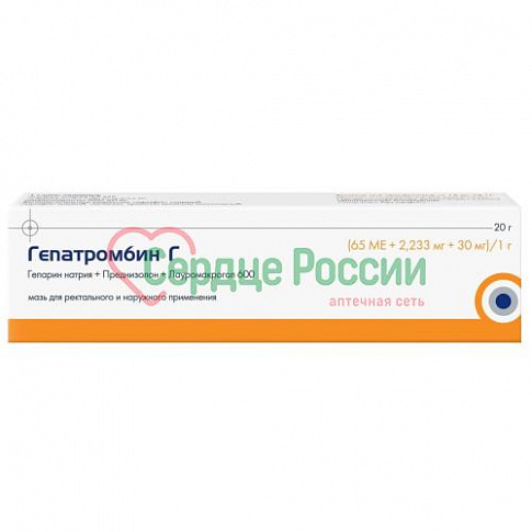 Гепатромбин Г Мазь д/ректальн . и наружн . прим .: туба 20 г в компл . с наконечником д/ректальн . введения . рег . №: П n015945/01 . . . 1 супп . гепарин . . .