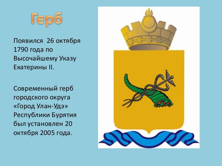 Герб Бурятии . Герб Улан-Удэ был утверждён 2005 года и использование его регламентировано решением от 20 октября 2005 г . № 261-32 "Об утверждении изображений герба, флага города Улан-Удэ и положений "О гербе города Улан-Удэ", "О флаге города Улан-Удэ" .