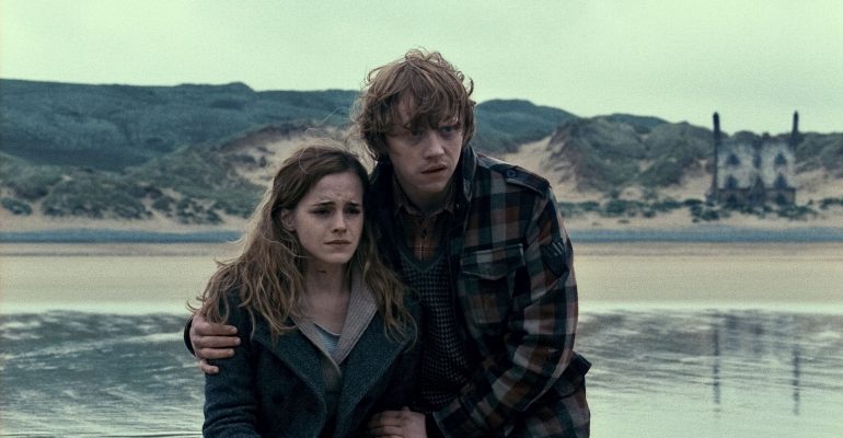 Гермиона Грейнджер, девушка Рона Уизли и лучшая подруга Гарри Поттера, и Джинни Уизли, девушка Гарри и сестра Рона, закрылись в ванной дома Уизли «Нора», где Гермиона гостила .