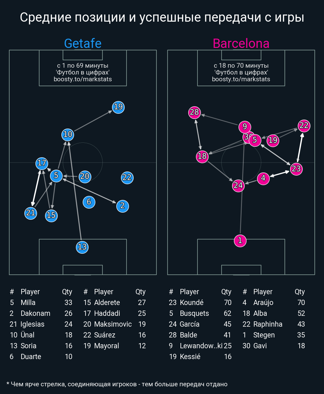 35 успешных передач из 42 попыток (2 с продвижением, 14 на трети соперника)