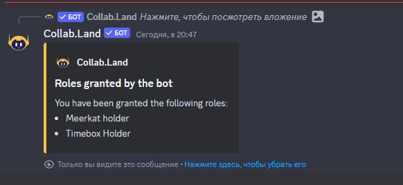 10) Return to Discord and see a message in the same channel that the Meerkat Holder and Timebox Holder roles have been issued
