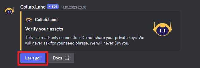5) This channel binds the wallet to the Collab Land bot, which checks for NFT on the wallet. Click on the Let's Go!