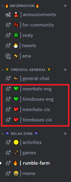 After getting the Meerkat Holder and Timebox Holder roles, four new channels will appear in the channel list - 💚││meerkats-eng / 💚││timeboxes-eng (English-language chat) and 💖│meerkats-cis / 💖│timeboxes-cis (Russian-language chat).