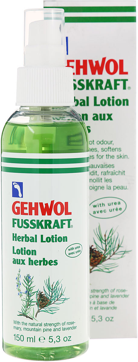 Средство Gehwol Fusskraft Herbal Lotion содержит большое количество натуральных эфирных масел из розмарина, горной сосны и лаванды, дезодорирующие и дезинфицирующие элементы, охлаждающий ментол, ингредиенты на основе карбамида. Лосьон обладает приятным нежным запахом и дезодорирующими свойствами, но кроме этого он смягчает жесткую кожу и оказывает нормализующее воздействие на процесс потоотделения.