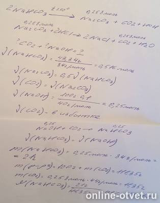 0 0 . Ответ: Запишем уравнения реакций: 2KHCO3 = K2CO3 + CO2 + H2O . С гидроксидом натрия, в зависимости от соотношения веществ, возможны реакции: NaOH + CO2 = NaHCO3 (1) 2NaOH + CO2 = Na2CO3 + H2O (2) Вычислим количество карбоната калия, углекислого газа и гидроксида натрия: n (K2CO3) = 2,07 : 138= 0,015 моль .